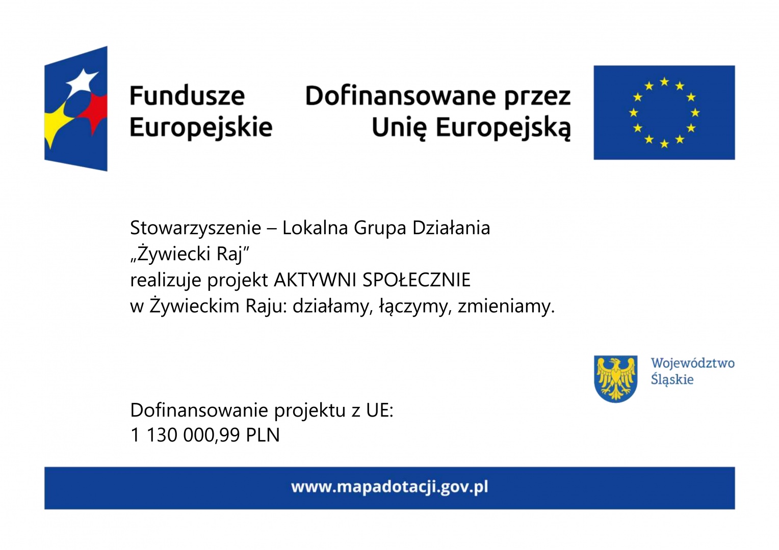 Projekt współfinansowany ze środków Europejskiego Funduszu Społecznego Plus (EFS+) w ramach programu Fundusze Europejskie dla Śląskiego 2021–2027, Priorytet FESL.07.00 „Fundusze Europejskie dla społeczeństwa”, Działanie FESL.07.10 „Wsparcie społeczności objętych LSR”.